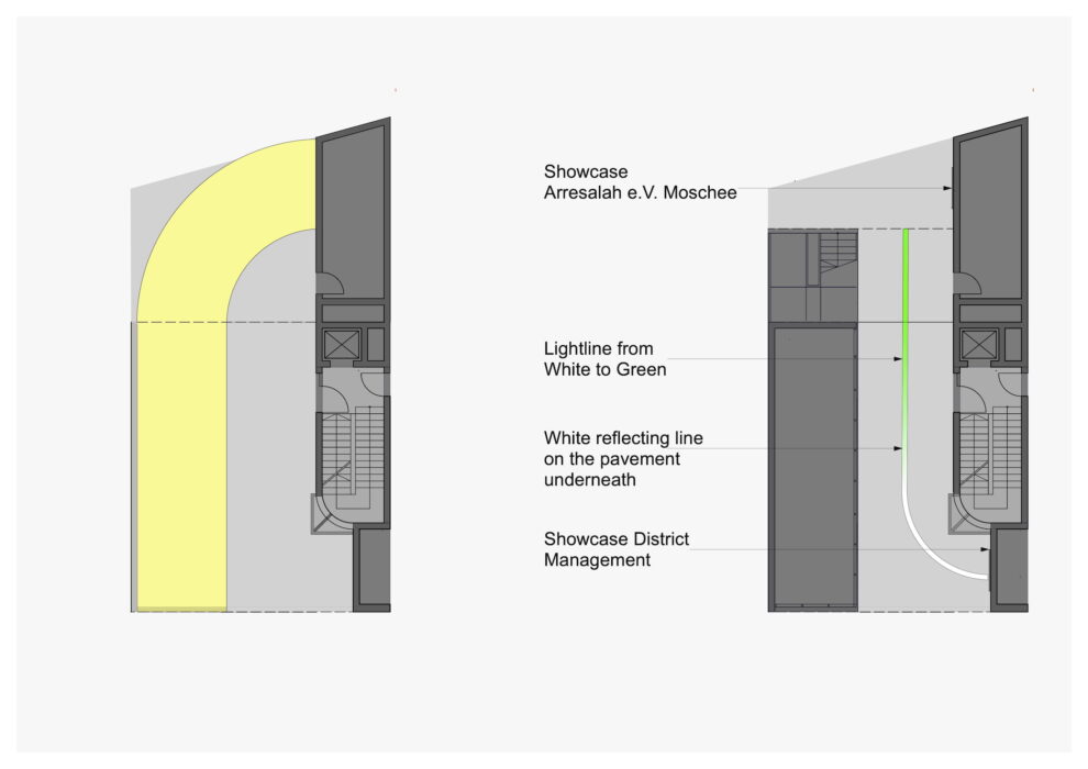 In dem Gebäude Turmstrasse 83 wurde die Rampe für das Parkdeck im ersten Obergeschoss entfernt. Das ehemalige Parkdeck - ein Luftgeschoss - wurde geschlossen und wird von einem muslimischen Verein genutzt. Finanziert durch Mittel des Förderprogramms "Aktive Zentren" wurde der öffentliche Durchgang durch das Gebäude in den Park im Verlauf von Weiß nach Grün beleuchtet. An der Stelle der ehemaligen Rampe befindet sich jetzt eine kleine, verglaste Gewerbeeinheit. Eine geschwungene Lichtlinie an der Decke und eine Linie auf dem Boden erinnern an die ehemalige Betonrampe und weisen den Weg in den Park. Die Lichtinstallation spiegelt sich in den angrenzenden Fassadenflächen.