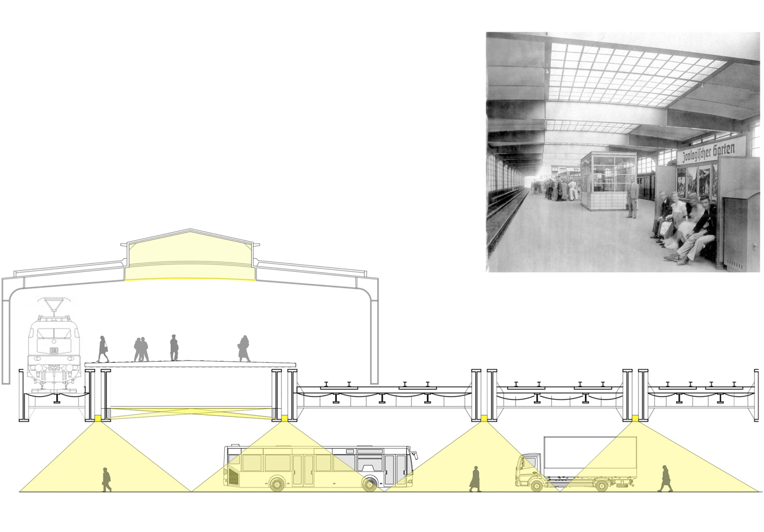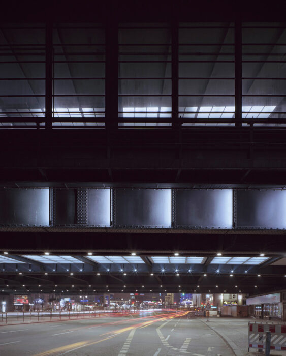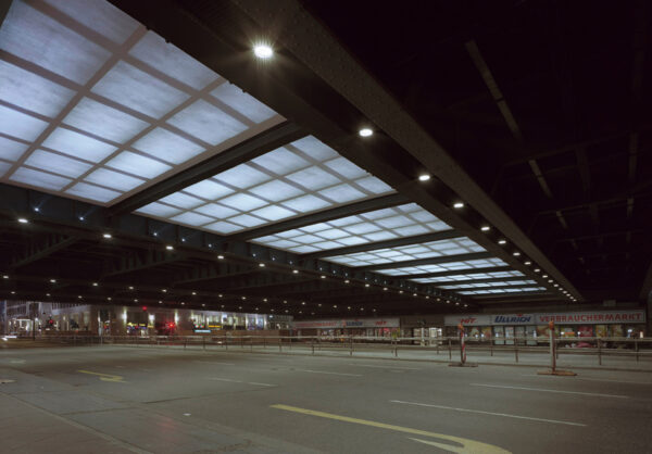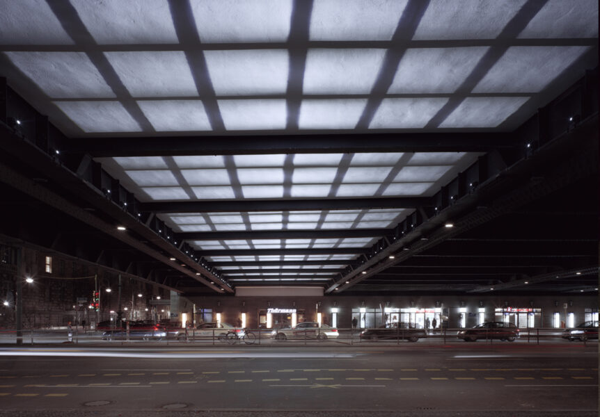 Neben der technischen Strassenbeleuchtung war die Unterführung Stadtbahnbrücke Hardenbergstrasse am Berliner Bahnhof Zoologischer Garten künstlerisch zu beleuchten. Die Putzflächen unter dem S-Bahnsteig wurden erneuert, weiß gestrichen und dienen so als Projektionsfläche der Illusion einer Lichtdecke, die sich in Wirklichkeit eine Etage darüber befindet. Als Allgemeinbeleuchtung dienen vier Linien von Lichtpunkten zwischen den Hauptträgern, die den gesamten Brückenraum überspannen. Die Leuchten sitzen Unterkante bündig an den jeweiligen Kreuzungspunkten der Träger. Auch die Punktlinien erinnern an die Bewegung der Züge oberhalb der Decke und verstärken beim Passieren die perspektivische Wirkung der nicht parallelen Linien.
