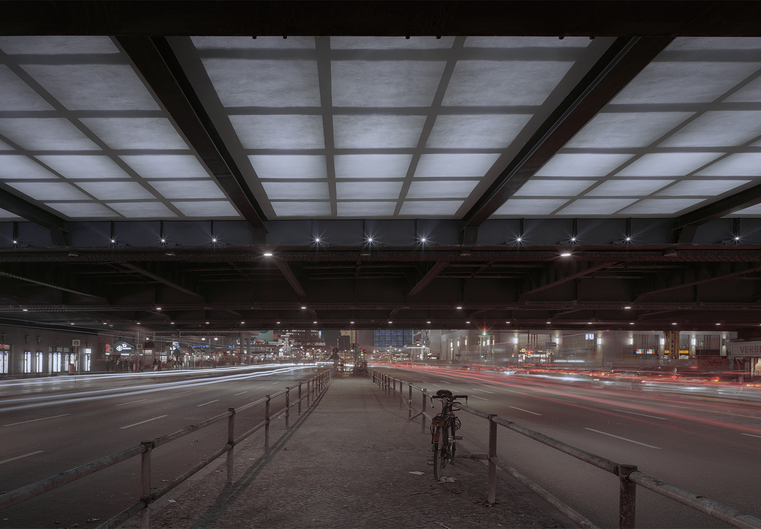 Neben der technischen Strassenbeleuchtung war die Unterführung Stadtbahnbrücke Hardenbergstrasse am Berliner Bahnhof Zoologischer Garten künstlerisch zu beleuchten. Die Putzflächen unter dem S-Bahnsteig wurden erneuert, weiß gestrichen und dienen so als Projektionsfläche der Illusion einer Lichtdecke, die sich in Wirklichkeit eine Etage darüber befindet. Als Allgemeinbeleuchtung dienen vier Linien von Lichtpunkten zwischen den Hauptträgern, die den gesamten Brückenraum überspannen. Die Leuchten sitzen Unterkante bündig an den jeweiligen Kreuzungspunkten der Träger. Auch die Punktlinien erinnern an die Bewegung der Züge oberhalb der Decke und verstärken beim Passieren die perspektivische Wirkung der nicht parallelen Linien.